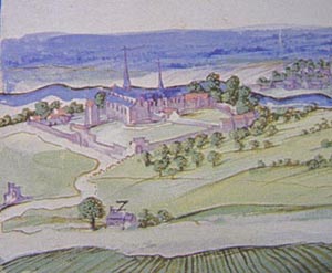 On aperçoit l'abbaye en arrière-plan sur la gauche